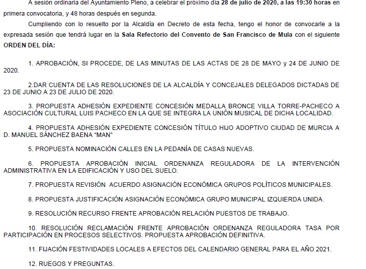 Os informamos del próximo pleno municipal ordinario, que se celebrará el próximo martes 28 de julio a las 19:30h