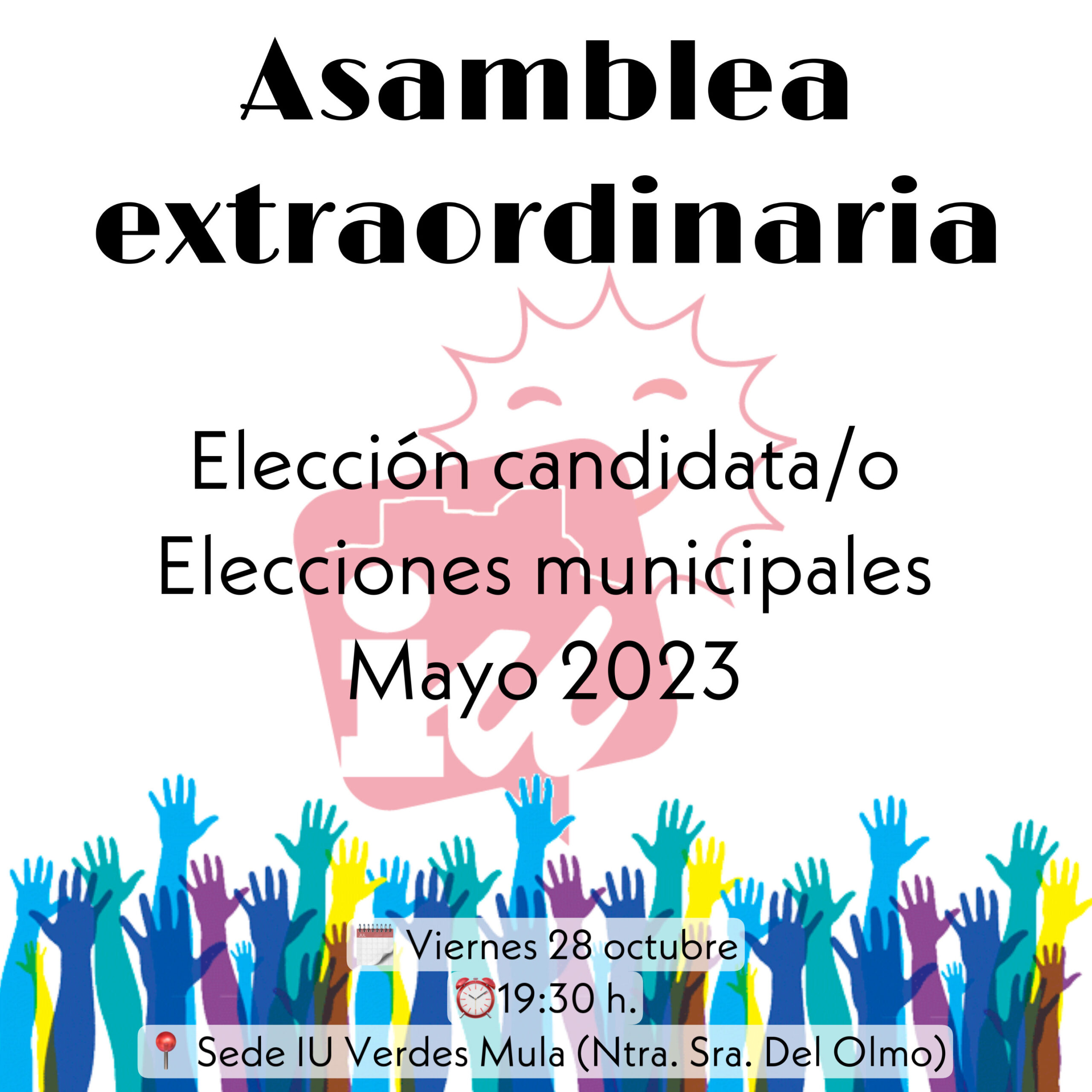 El próximo 28 DE OCTUBRE A LAS 19.30H tendrá lugar en nuestra sede en Mula una ASAMBLEA EXTRAORDINARIA para elegir a nuestro candidato de cara a las próximas elecciones municipales de 2023.